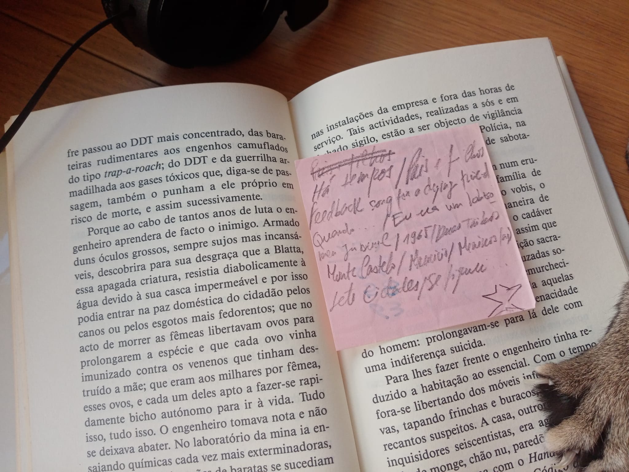 Constatei, ao relê-lo agora, que continua soberbo. Também dei de caras com um artefacto curioso: um post-it com o alinhamento das canções de As Quatro Estações, da Legião Urbana, que ouvia obsessivamente nesses tempos, a servir de marcador. Há uns tempos, já não sei em que livro, encontrei outro post-it, com o onze do Benfica da altura da primeira passagem de José Mourinho, com Maniche numa das alas, Diogo Luís na lateral esquerda e João Tomás na linha da frente.